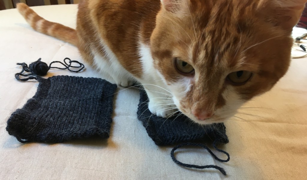 The actual construction is quite simple; the mitts are essentially just rectangles. The rectangles are sewn together end-to-end leaving a space for the thumb.