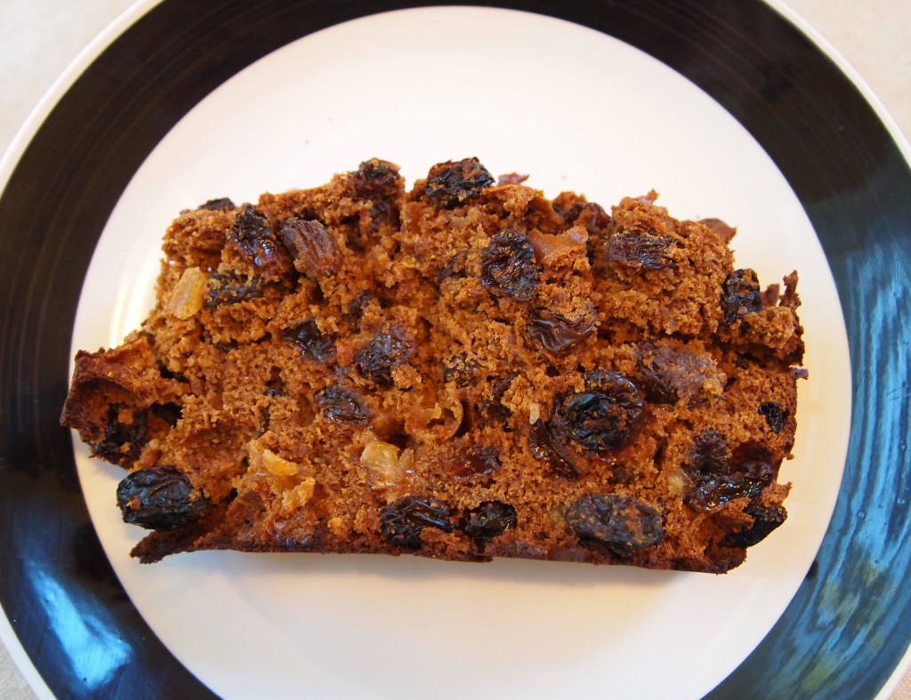 This tasted like a cross between gingerbread and fruit cake. It’s very very dense, and gets denser (but also kind of better) the longer you keep it. I didn’t really taste the coffee at first; mostly it tasted like molasses and raisins (no surprise when there’s a pound of raisins in there). After sitting around for about a week the flavors got stronger and I thought I could sort of taste the coffee…at the very least, it definitely tastes like an extremely dark gingerbread. With lots of raisins. And some lemon. But mostly raisins.