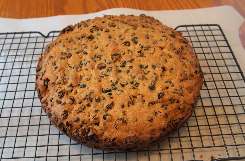 I used a 9 inch round cake pan, and baked the cake at 325 degrees for about an hour and a half. The almond “icing” is actually an almond paste; it needs to be rolled out in a circle and then placed on top of the cake.