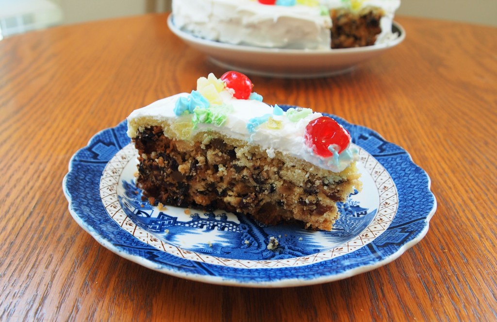 I was surprised that despite the almonds in the cake, the almond paste, and the almond flavoring in the icing, the cake still didn’t taste much like almonds. There was just a very subtle almond flavor, slightly stronger when eating the actual almond paste. I also didn’t taste the candied citron much; I wonder if it might be better to use fresh citron or lemon peel to get a more present citrus flavor.