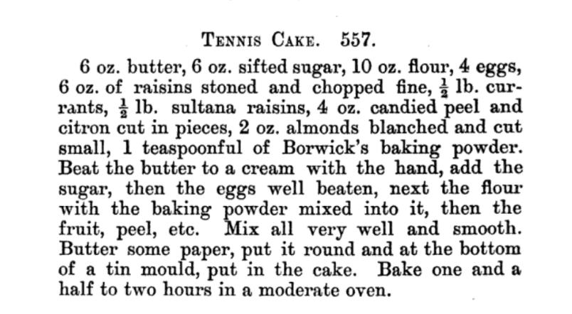 For my tennis cake, I used an 1885 recipe from Mary Davies’ The Menu Cookery Book. Her book is subtitled “for moderate people with moderate incomes.” If her book is really meant for people with moderate incomes, dried fruit and nuts must have been cheap in the 1880s; her tennis cake recipe is about 50% fruit and almonds by weight!