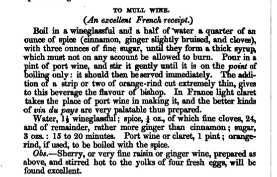 Although I have made mulled wine many times in my life, I had never made it with port before, and I definitely think it is an improvement. The richness and fruitiness of the port worked really well in this. I thought the amounts of sugar, water, and orange peel given by Eliza Acton were perfect; the spices, however, were just a little too subtle. While I still liked it, if you prefer stronger spices feel free to use more. That’s the beauty of mulled wine; it’s very easy to adjust to individual tastes. Overall, this is an excellent base recipe, and makes a wonderful warming drink perfect for drinking to your Uncle Scrooge’s health on cold winter nights.