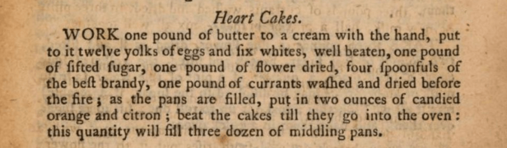 These 18th century heart cakes are a variation on queen cakes, which were also often baked in heart-shaped tins. This recipe, from Charlotte Mason’s 1777 book The Lady’s Assistant, spruces up a basic queen cake recipe with the addition of candied orange peel and citron. You could certainly bake them in regular muffin tins, too – but as hearts, they are perfect for Valentine’s Day!