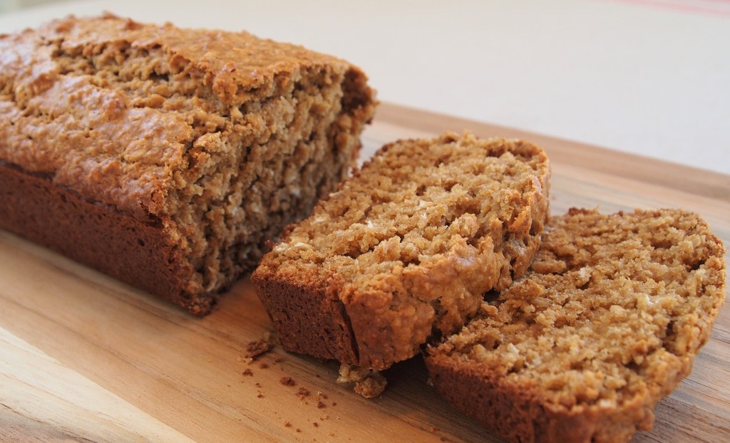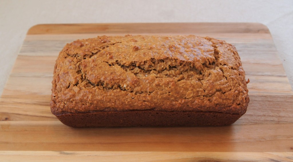 - Mix thoroughly, then place in a buttered 8″ x 4″ loaf pan and bake at 350 degrees for 50 minutes to an hour. The edges should be browning and a toothpick inserted in the middle should come out clean. If the edges are starting to brown too much before the middle is done, cover the pan with aluminum foil to protect it while it finishes cooking. Let the finished loaf cool before slicing into it.