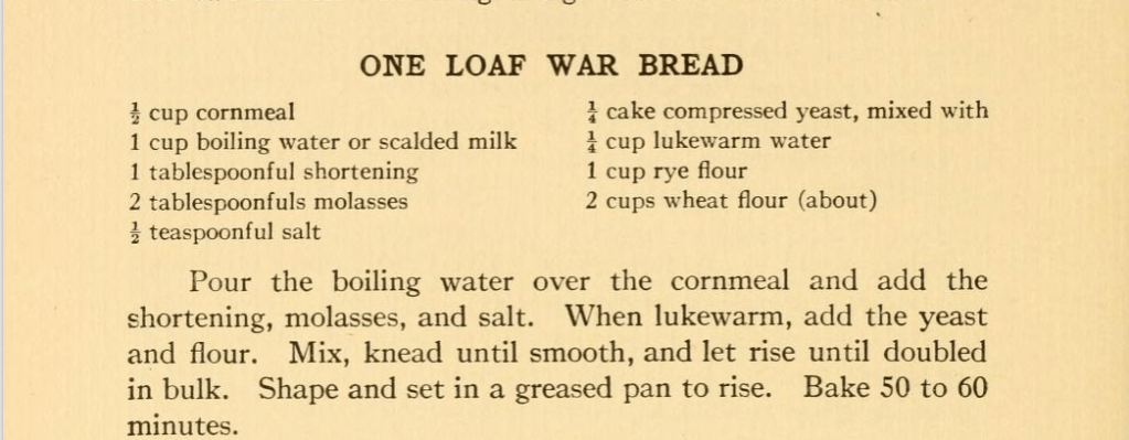 As expected from the rye flour and cornmeal content, this is a fairly dense, very hearty bread. It does taste good though, especially considering that it was designed to prevent waste and use inexpensive ingredients! It’s interesting to see World War I-era recipes that compensate for flour shortages after living through some of the shortages in the Covid-19 pandemic. In my area, it was difficult to find all-purpose flour for the first month or so – but it took even longer for rye flour to come back on the shelves, so I couldn’t have made this bread then! During World War I, rye and wheat flour were seen as lower quality and less desirable than white flour, but in our time they are actually often more expensive and difficult to find.