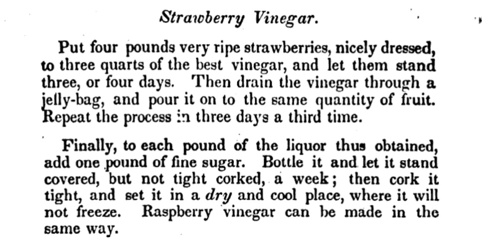 Although made with vinegar, it really is more like a strawberry-flavored syrup; once the sugar is added, it tastes very sweet without a hint of the original vinegar. Fruit vinegars like this one were often used to flavor beverages, especially non-alcoholic drinks. Catharine Beecher includes this recipe in her chapter on “Temperance Drinks”: