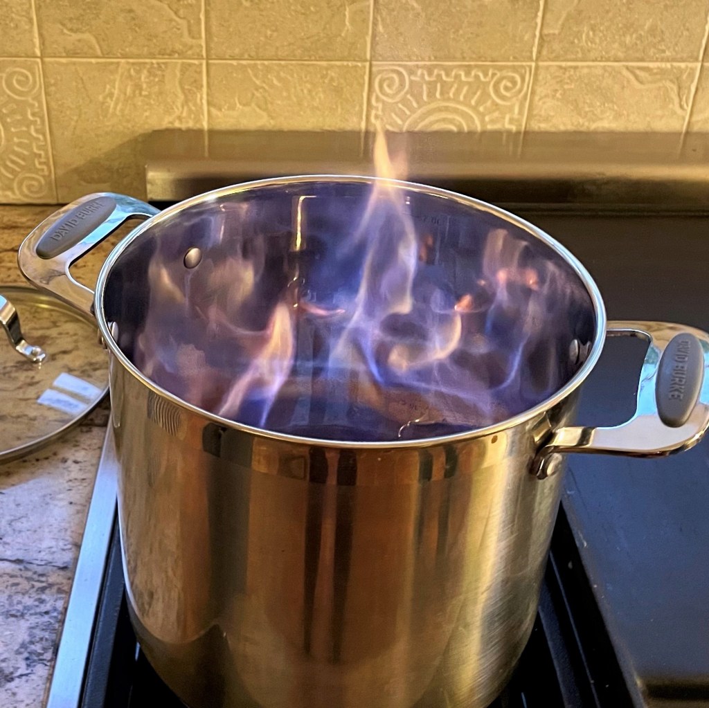 - Gently pour the flaming contents of the spoon back into the pot. Once the rest of the pot is on fire, let it burn for about three to four minutes (Dickens says to stir it occasionally during this time, but I left it alone – I didn’t have a metal spoon long enough to safely reach through the flames).