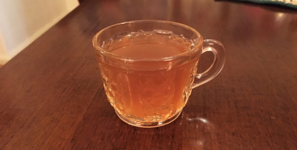 Charles Dickens knew his stuff; this punch is delicious. I made it on Christmas Eve, and so was able to drink it during my annual watching of A Christmas Carol (another Dickens story in which punch is mentioned several times). The punch is good both warm and cold. Especially when it’s cold, the flavor reminds me of an Arnold Palmer – it tastes like lemon and tea, even though there’s no tea in it. It was also delicious mixed 50-50 with hot apple cider, if you want to dilute the alcohol a bit.