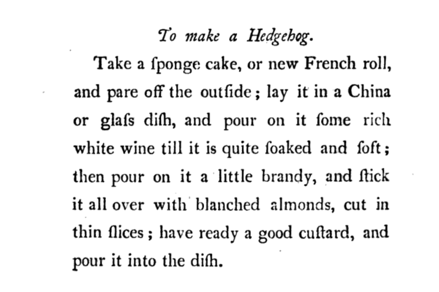 Last year, I made an 18th-century recipe for a hedgehog, a popular dessert in which an almond paste was formed into the shape of a hedgehog and stuck with almond slices to resemble spines. The idea of the hedgehog-shaped dessert survived into the 19th century, but later recipes started using a cake as the base of the hedgehog instead. This recipe, from Addison Ashburn’s 1807 cookbook The Family Director, calls for either a sponge cake or a French roll as the hedgehog base. The base is then soaked in wine and brandy and surrounded by custard, making this version just as decadent as its 18th-century predecessors.