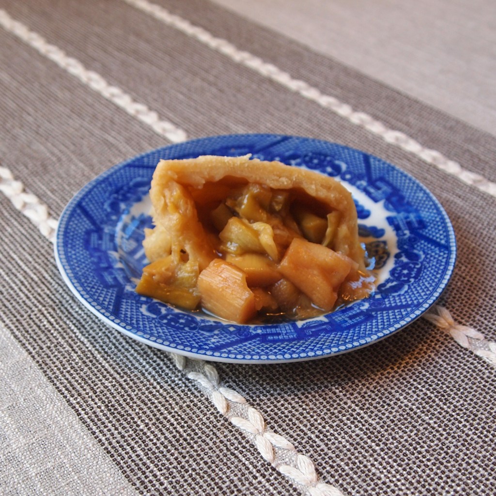 - Put the mixed rhubarb and sugar into the pudding basin and cover with the pastry lid. Fold the edges of the pastry over the lid and seal with a little cold water.