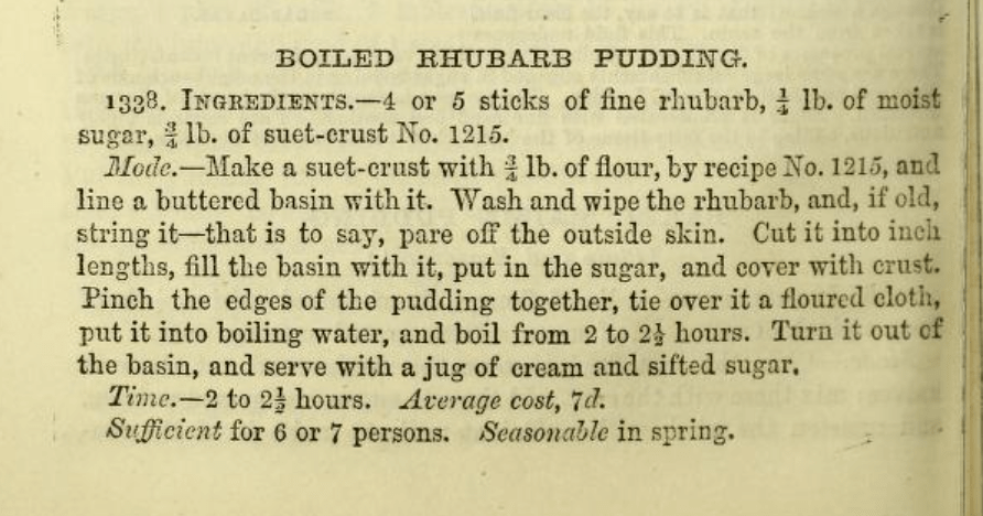 One of my favorite things about Isabella Beeton’s 1861 cookbook, The Book of Household Management, is that she lists practical information about the cost, time to make, serving size, and season for each recipe. Knowing the season was especially important; although some fruits and vegetables could be grown in greenhouses all year, others were only available for short windows of time. Even today, that’s still the case with rhubarb, which in my area at least only appears for a few brief weeks in late spring. To make this recipe, I started haunting my grocery stores and local farmers’ markets at the start of April, checking constantly for the first sign of rhubarb’s bright red stalks. Somehow, the excitement of finally finding it after weeks of waiting feels much more gratifying than if I had been able to get it all year round.