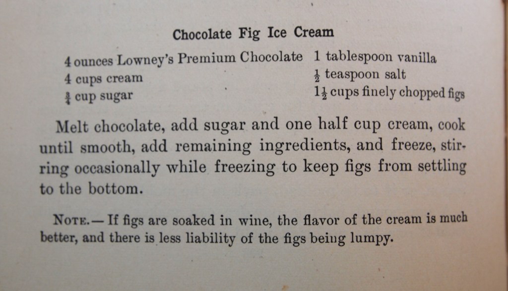 The book was published by the Walter M. Lowney Company, which was a company that primarily produced chocolate (I’m pretty sure the illustration on the cover is meant to represent cocoa trees). While it is a general cookbook with recipes for all different types of food, there is definitely a focus on chocolate in the dessert chapters. Since I’m always in the mood for eating chocolate, I decided to try one of the chocolate recipes, Chocolate Fig Ice Cream, for my first foray into this book.