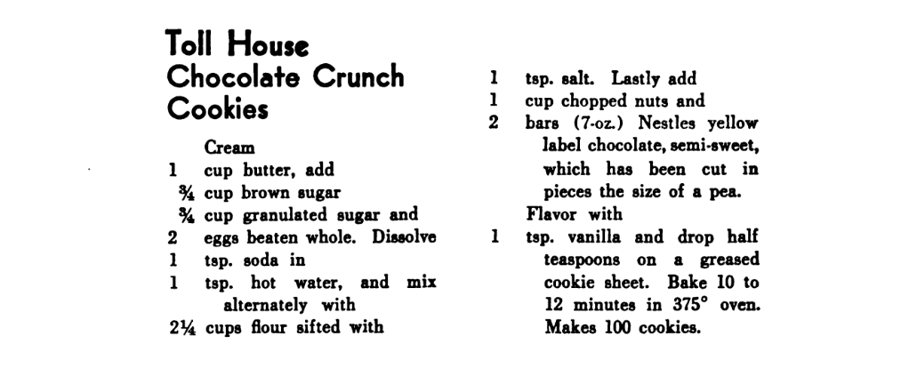 Wakefield, R.G. (1940). Ruth Wakefield’s Toll House tried and true recipes. New York: M. Barrows & Company, Inc. https://catalog.hathitrust.org/Record/009058783