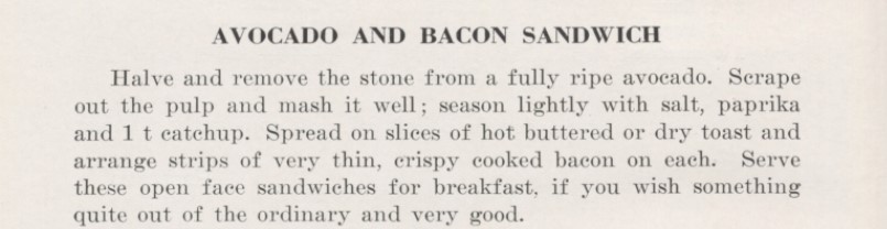 I had to make this recipe from a 1933 cookbook just to show that avocado toast has been around for longer than you might think. Avocados were first cultivated in the United States starting in the early 1900s, and became very popular by the 1920s. They were used in all sorts of recipes, including open-faced sandwiches like this one – or, as we would call it today, avocado toast.