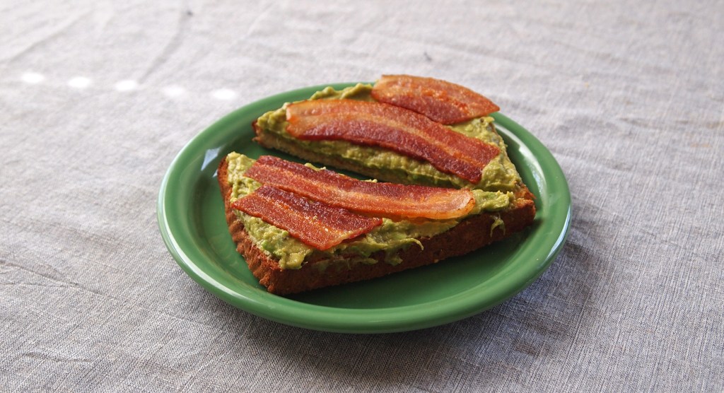 - Spread the avocado on the toast and top with bacon strips.