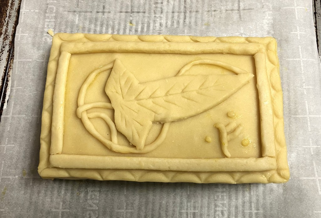 Ultimately, however, I wanted to try something a little bit simpler for my first foray into hot water pastry…and because the word “pippin” always makes me think of Pippin Took from The Lord of the Rings, I ended up creating my own design of a Lothlorien-inspired leaf and Gandalf’s rune. It may not be 100% historically accurate, but leafy designs were popular in the 17th century and I’m usually willing to sacrifice a bit of historical accuracy if it means I can incorporate some LOTR fandom.