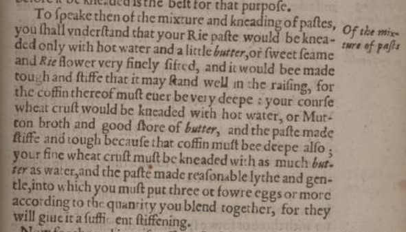 While Gervase Markham does give relative quantities of butter and water in his recipe, he does not specify how much flour should be used, so I followed Townsends’ directions for making the same pastry (see also for an excellent explanation of why pastry cases were often called “coffins”).