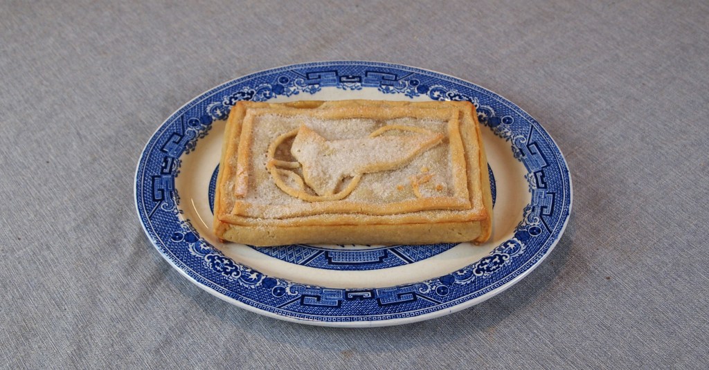 The filling of this tart is delicious, as baked apples usually are, although you do have to be wary of the whole cloves and cinnamon. Eating this probably would have been easier if I had cut the pippins in half as Gervase Markham instructs; then you would be able to cut off the lid and simply pick individual pippins out of the tart, rather than eating it in a slices like with a modern pie. I was a contrarian though and did cut mine into slices, mostly because I wanted to actually try the pastry. It was surprisingly good – definitely a bit stodgier than the ideal pie crust, but certainly still edible (and very buttery). The one thing I didn’t like about this tart was the sugar topping at the end, since it ended up obscuring the details of my design. The sides of my tart also buckled a little while baking. I think I may have needed to leave the pastry out even longer to firm up before using it. Still, it remained structurally intact with no major leakage, so I consider my first venture into hot water pastry a success!