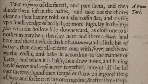Pippins are a variety of apple mainly grown for use in hard cider today. Historically, however, they were often used in puddings and baked desserts such as this 1623 recipe from Gervase Markham for A Pippin Tart.