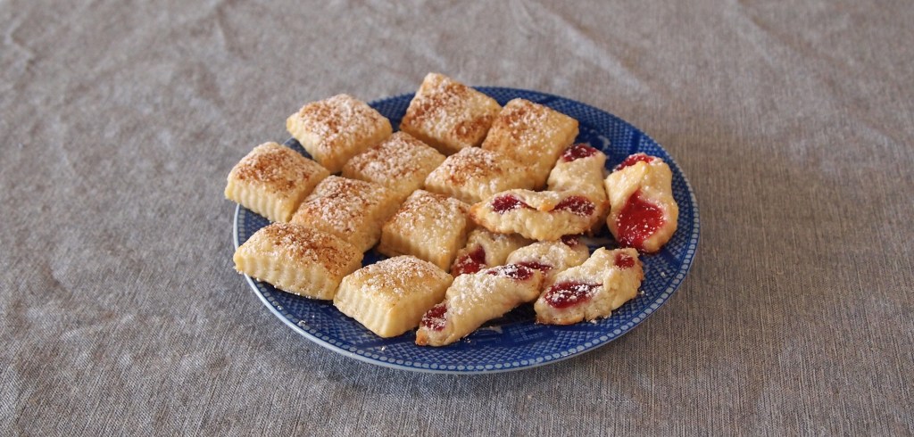 While the jam cookies did taste good, I think I actually preferred the plain ones. The cookies rose up a lot in the oven and were just as light and flaky as a puff pastry, but were much, much easier to make. The plain cheese cookies would be excellent if you need to make a quantity of cookies and don’t have a lot of time. As long as you have the time for chilling the dough, the active time rolling out and cutting the cookies into squares doesn’t take very long. The cookies were still good after a few days too, but for maximum flakiness you should eat them while they’re still slightly warm from the oven.