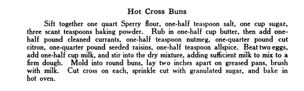 Hot cross buns are traditionally served on Good Friday. I made a classic yeasted version of hot cross buns a few years ago, but for this year I wanted something a little easier. This recipe comes from The Bride’s Cookbook, a 1910 cookbook that was produced by local businesses in San Francisco and given to newly wedded brides for free in order to advertise their products. Since these buns are raised with baking powder rather than yeast, they are much quicker and easier to make than traditional buns.