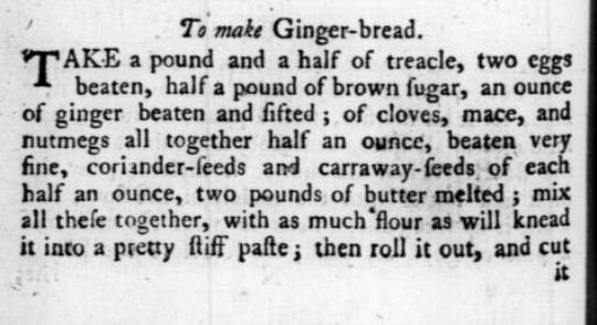 I first encountered and saved this recipe when looking through Eliza Smith’s 1739 cookbook, The Compleat Housewife. Then, while reading the modern cookbook How to Cook the Victorian Way With Mrs. Crocombe, I realized that they seemed to have almost the exact same recipe (although they adjusted some of the ingredient proportions) – but attributed it to Maria Rundell’s 1807 cookbook instead. Sure enough, Rundell’s recipe is nearly identical to Smith’s, although she halves the recipe and adds allspice to the list of spices. Finally, after I had already made the recipe, I saw that Tasting History with Max Miller’s YouTube channel had made a gingerbread from John Townshend’s 1773 cookbook that turned out to be word-for-word the same as Eliza Smith’s (the only difference is that he omits the word “London” before “treacle”).